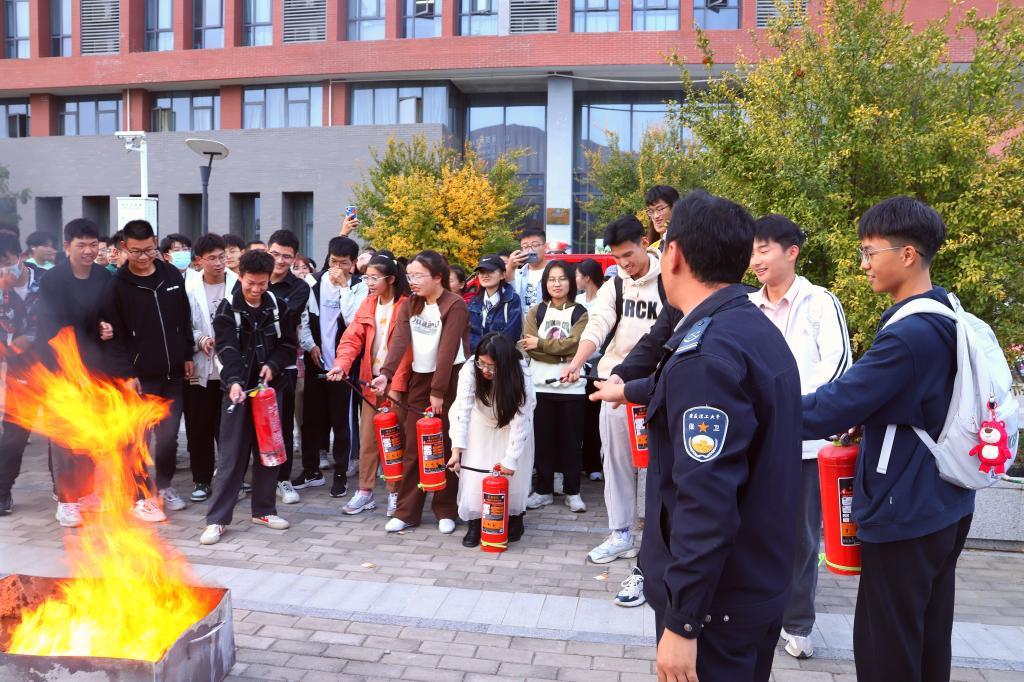 邀请校保卫处消防科彭广峰为新生在明道楼下开展消防安全知识教育与灭火演练活动。