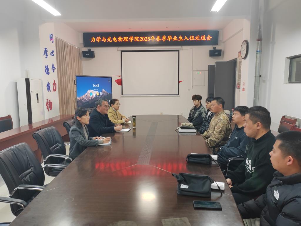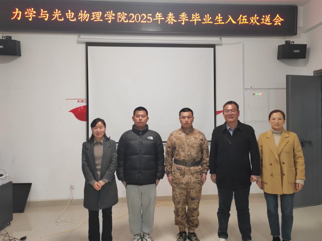 在明道楼A320报告厅举行2025年春季大学生入伍欢送会,欢送学院即将启程奔赴军营的2名准新兵应届毕业生。学院党委书记孙东升、常务副院长高娟、党委副书记郑孝莲、毕业班辅导员、有应征意向的毕业班学生参加活动。