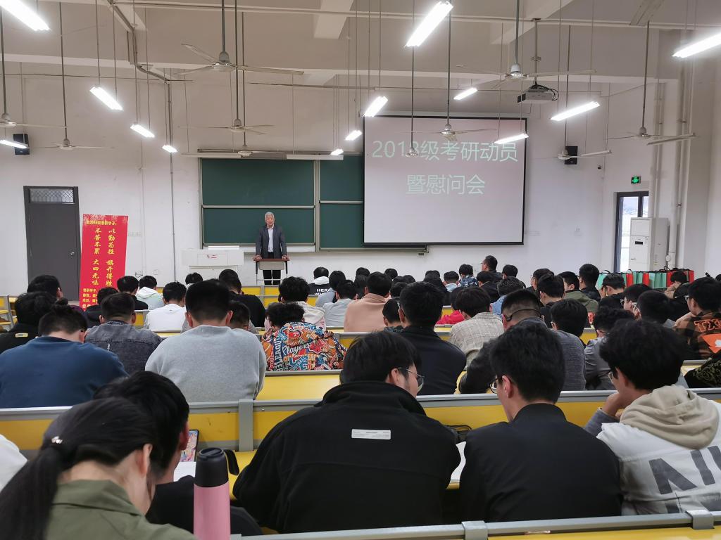 在明理103教室召开考研动员大会暨考研慰问会。院长经来旺、党委副书记孙东升出席会议。2018级全体考研学生参加动员会。